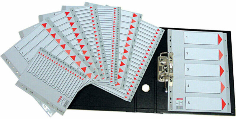 -vegyes színű regiszter -nagyméretű téglalapok az előlapon a tartalom feltüntetésére -1-12 felirattal rendelkező regiszter fülek a dokumentumok gyors eléréséhez -nyomtatható tárgymutató az egyedi igényekhez -megerősített lefűzőrész az előlapon hagyományos, 11-lyukú lefűzőrész -0,3 mm vastag PP alapanyag -az A4+ méret elválasztólapok regiszter része szélesebb, mint
