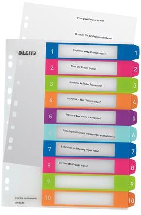 vegyes színű regiszter nagyméretű téglalapok az előlapon a tartalom feltüntetésére 1-10 felirattal rendelkező regiszter fülek a dokumentumok gyors eléréséhez, nyomtatható tárgymutató az egyedi igényekhez megerősített lefűzőrész az előlapon hagyományos, 11-lyukú lefűzőrész 0,3 mm vastag PP alapanyag az A4+ méret elválasztólapok regiszter része szélesebb, mint a sta