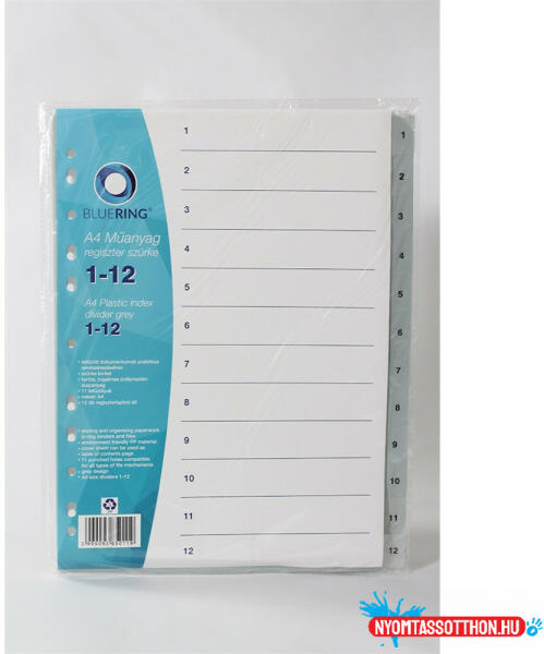 Regiszter műanyag 1-12 Bluering® szürke Minőségi PP alapanyagból készült regiszter iratok kategorizálásához, praktikus rendszerezéséhez. 11 lefűzűlyukkal, A4 méretű iratokhoz.