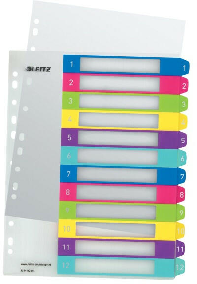 Regiszter LEITZ Wow A/4 műanyag nyomtatható extra széles 1-12 Többször használható regiszter élénk színkombinációkban. Egyénileg tervezhető tárgymutató a www. leitz. com/easyprint weboldalon keresztül.