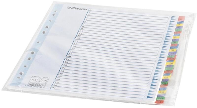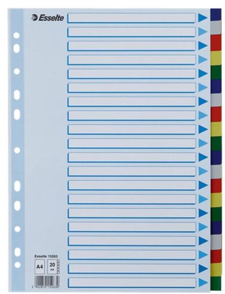 Regiszter ESSELTE Elválasztólap. Megerősített hagyományos, 11-lyukú lefűzőrész. Méret: A/4, 225x3x297 mm. Regiszterek száma: 20 színes fül. Alapanyag: 0,12 mm vastag PP. Súly: 0,14 kg. Szín: Több színű.