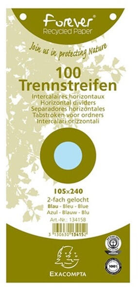 Exacompta 105x240mm 100db/cs kék elválasztócsík - Kiváló minőségű, színes elválasztócsíkok - 100%-ban újrahasznosított alapanyagból készült - Méret: 105 × 240 mm, 100 db/csomag - Szín: kék