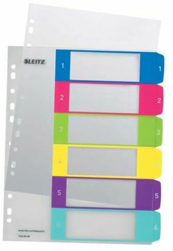 - tartós elválasztólap élénk színkombinációkban - újrahasznosított, Blue Angle minősítéssel rendelkező karton alapanyag - nagyméretű téglalapok az előlapon a tartalom feltüntetésére - megerősített lefűzőrész az előlapon - hagyományos, 11-lyukú lefűzőrész - 6 színes fül a könnyű rendszerezéshez - strapabíró, 160 g-os karton alapanyagból készült Gyártó/els