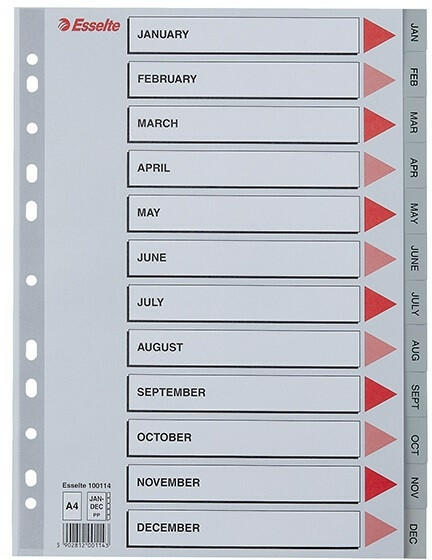 Regiszter ESSELTE A/4 műanyag Jan-Dec szürke Szürke színű regiszter. Nagyméretű téglalapok az előlapon a tartalom feltüntetésére. Megerősített lefűzőrész az előlapon Jan-Dec felirattal rendelkező regiszter fülek a dokumentumok gyors eléréséhez Hagyományos, 11-lyukú lefűzőrész A4 méret 0,12 mm vastag PP alapanyag