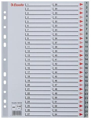 Szürke színű regiszter. Nagyméretű téglalapok az előlapon a tartalom feltüntetésére. Megerősített lefűzőrész az előlapon 1-54 felirattal rendelkező regiszter fülek a dokumentumok gyors eléréséhez Hagyományos, 11-lyukú lefűzőrész A4 méret 0,12 mm vastag PP alapanyag