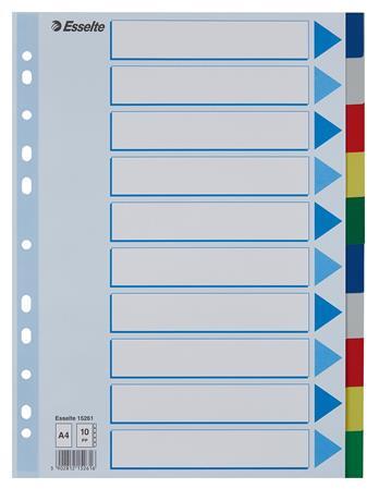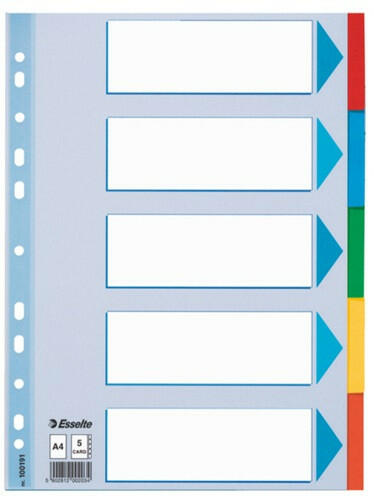 Elválasztólap karton Esselte Standard A/4 5 részes színes 100191 tartós elválasztólap írható előlappal felhasználható iratrendezőkben, gyűrűskönyvekben újrahasznos ított, Blue Angle minősítésű, 160 gr-os karton alapanyag 11 lyukú lefűzőrész 5 részes szín: többszínű méret: A/4