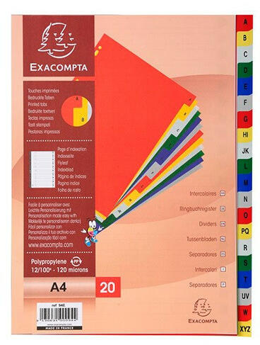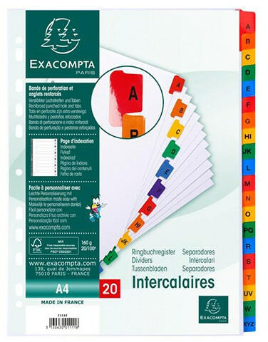 Regiszter PP Exacompta A/4 A-Z 20 részes színes Méret: A/4 Kiváló minőségű színes, műanyag regiszterek Alapanyag: 120 mikronos műanyag Előre lyukasztott, így lefűzhető mappába vagy dossziéba