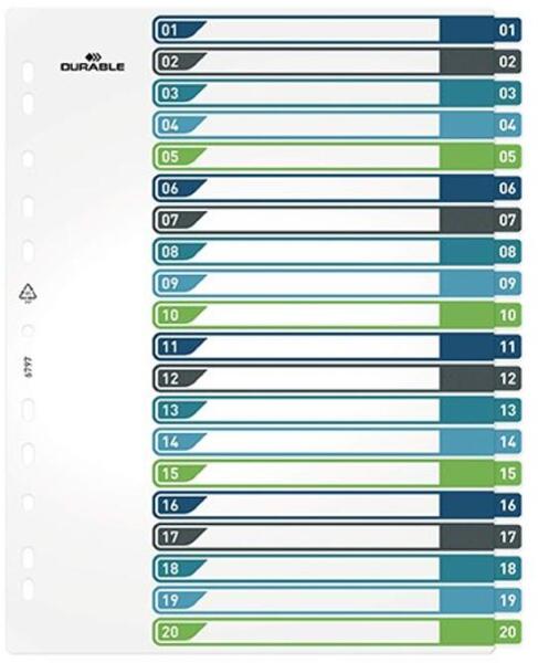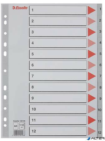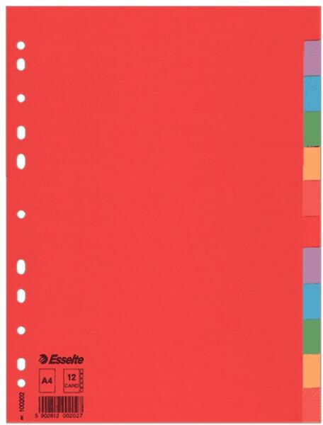 - tartós elválasztólap élénk színkombinációkban - újrahasznosított, Blue Angle minősítéssel rendelkező karton alapanyag - nagyméretű téglalapok az előlapon a tartalom feltüntetésére - megerősített lefűzőrész az előlapon - hagyományos, 11-lyukú lefűzőrész - 12 színes fül a könnyű rendszerezéshez - strapabíró, 160 g-os karton alapanyagból készült Gyártó/el