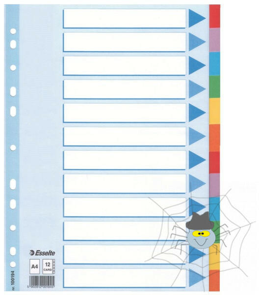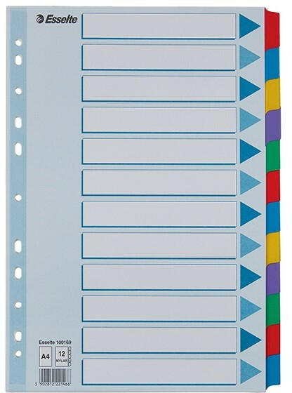 Regiszter ESSELTE Mylar A/4 laminált karton 12 részes Tartós regiszter élénk színkombinációkban. Nagyméretű téglalapok az előlapon a tartalom feltüntetésére. Erős, tartós, laminálással megerősített regiszter fülek Megerősített lefűzőrész az előlapon 12 színes fül a könnyű rendszerezéshez Hagyományos, 11-lyukú lefűzőrész A4 méret Erős, 160 g-os karton alapany