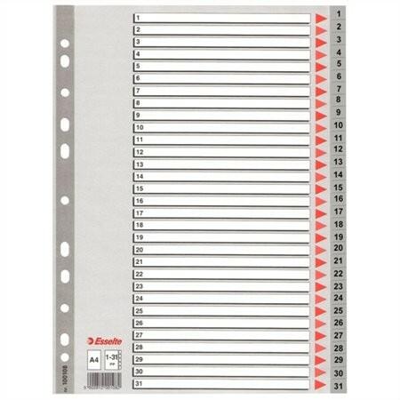 Regiszter, műanyag, A4, 1-31, Esselte, szürke - szürke színű regiszter - nagyméretű téglalapok az előlapon a tartalom feltüntetésére - 1-31 felirattal rendelkező regiszter fülek a dokumentumok gyors eléréséhez - megerősített lefűzőrész az előlapon - hagyományos, 11