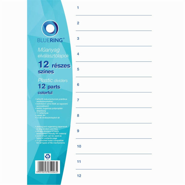 Tartós elválasztólap élénk színkombinációkban. Újrahasznosított karton alapanyag. 10 színes fül a könnyű rendszerezéshez. Hagyományos, 11-lyukú lefűzőrész. A4 formátum. Erős, 160 g-os karton alapanyag. Blue Angel minősített, újrahasznosított karton alapanyag.