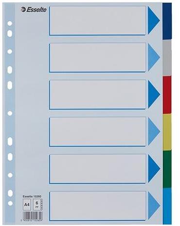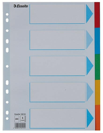 Regiszter ESSELTE Standard A/4 karton 5 részes Tartós elválasztólap élénk színkombinációkban. Újrahasznosított, Blue Angle minősítéssel rendelkező karton alapanyag. Nagyméretű téglalapok az előlapon a tartalom feltüntetésére. Megerősített lefűzőrész az előlapon 5 színes fül a könnyű rendszerezéshez Hagyományos, 11-lyukú lefűzőrész A4 méret Erős, 160 g-os kar