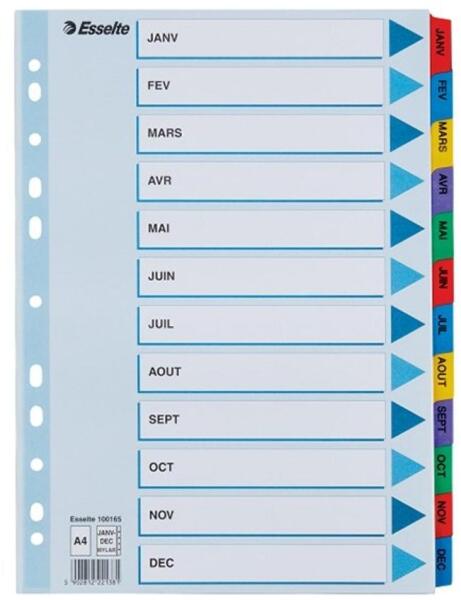 Színregiszteres karton elválasztólap iratok kategorizálásához. 11 lefűzőlyukkal, A4 méretű iratokhoz. Katalóguskód: 12222