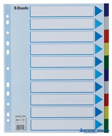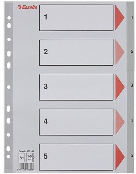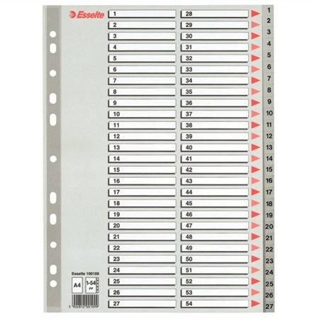 Regiszter, műanyag, A4, 1-54, ESSELTE, szürke (E100109) - szürke színű regiszter - nagyméretű téglalapok az előlapon a tartalom feltüntetésére - 1-54 felirattal rendelkező regiszter fülek a dokumentumok gyors eléréséhez - megerősített lefűzőrész az előlapon - hagyományos, 11-lyukú lefűzőrész - 0,12 mm vastag PP alapanyag Gyártó/első EU forgalmazó elérhetősége: Es