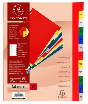 Regiszter PP Exacompta A/4 Maxi Jan-Dec 12 részes színes Méret: A/4 maxi Kiváló minőségű színes, műanyag regiszterek Alapanyag: 120 mikronos műanyag Előre lyukasztott, így lefűzhető mappába vagy dossziéba