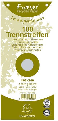 Elválasztócsík karton Exacompta 105x240 mm szürke 100 db/csomag Méret: 105 × 240 mm Kiváló minőségű karton elválasztócsíkok újrahasznosított alapanyagból Csomagolás: 100 db/csomag Szín: szürke Blue Angel minősítéssel rendelkezik