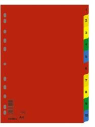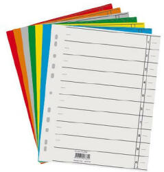 Színes, 10 részes, feliratozott, vonalazott elválasztólap. Újrahasznosított, 230 grammos karton alapanyagból készült. Mérete: 240 x 300 mm. A4-es iratokhoz, 11 lefűzőlyukkal 100 db lap / csomag .