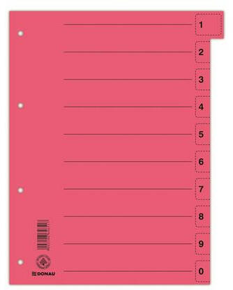 Regiszter, karton, A4, mikroperforált, DONAU, piros - lefűzött dokumentumok kategorizálására - színes - újrahasznosított, 250 g/m2 kartonból készült - mikroperforált fülek - 4 lefűzőlyuk - méret: 235x300 mm