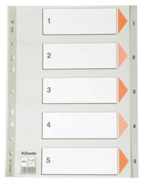 Regiszter, műanyag, A4, 1-5, ESSELTE, szürke (E100103) - szürke színű regiszter - nagyméretű téglalapok az előlapon a tartalom feltüntetésére - hagyományos, 11-lyukú lefűzőrész - 0,12 mm vastag PP alapanyag - megerősített lefűzőrész az előlapon - 1-5 felirattal rendelkező regiszter fülek a dokumentumok gyors eléréséhez - méret: 225x297 mm Gyártó/első EU forgalmazó