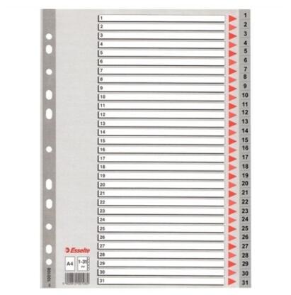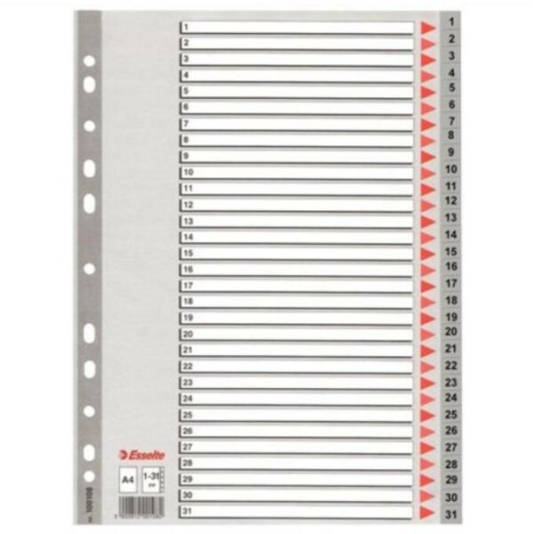 Szürke színű regiszter. Nagyméretű téglalapok az előlapon a tartalom feltüntetésére. Megerősített lefűzőrész az előlapon1-31 felirattal rendelkező regiszter fülek a dokumentumok gyors eléréséhezHagyományos, 11-lyukú lefűzőrészA4 méret0,12 mm vastag PP alapanyag Katalóguskód: 35875