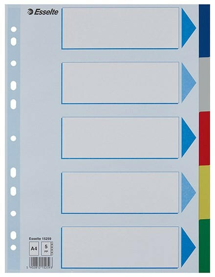 Regiszter ESSELTE A/4 műanyag 5 részes Elválasztólap visszafogott színkombinációkban. Nagyméretű téglalapok az előlapon a tartalom feltüntetésére. Megerősített lefűzőrész az előlapon 5 színes fül a könnyű rendszerezéshez Hagyományos, 11-lyukú lefűzőrész A4 méret 0,12 mm vastag PP alapanyag