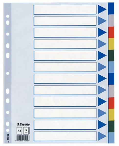 REGISZTER MŰANYAG A4, 12 RÉSZES ESSELTE Elválasztólap visszafogott színkombinációkban. Nagyméretű téglalapok az előlapon a tartalom feltüntetésére. Megerősített lefűzőrész az előlapon 12 színes fül a könnyű rendszerezéshez Hagyományos, 11-lyukú lefűzőrész A4 méret 0,12 mm vastag PP alapanyag Katalóguskód: 35871