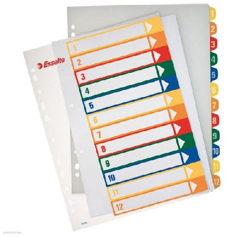 Regiszter ESSELTE A/4 műanyag 12 részes Elválasztólap visszafogott színkombinációkban. Nagyméretű téglalapok az előlapon a tartalom feltüntetésére. Megerősített lefűzőrész az előlapon, 12 színes fül a könnyű rendszerezéshez, hagyományos, 11-lyukú lefűzőrész, A4 méret (225 x 297), 0,12 mm vastag PP alapanyag.