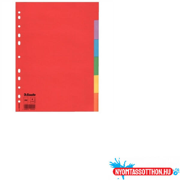 Regiszter A4, 6 részes karton Esselte Economy színes Tartós elválasztólap élénk színkombinációkban. Újrahasznosított karton alapanyag. 6 színes fül a könnyű rendszerezéshez Hagyományos, 11-lyukú lefűzőrész A4 formátum Erős, 160 g-os karton alapanyag Blue Angel minősített, újrahasznosított karton alapanyag