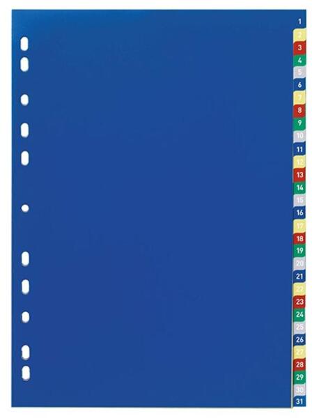 - lefűzött dokumentumok praktikus rendszerezéséhez - színes kivitel - tartós, rugalmas polipropilén alapanyag - 11 lefűzõlyuk - méret: A4 Csomagolási egység: 1 db Beosztás 1-5 Anyag műanyag Méret A4 Szín színes Újrahasznosított Nem