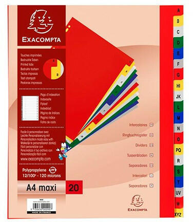 Regiszter PP Exacompta A/4 Maxi A-Z 20 részes színes Méret: A/4 maxi Kiváló minőségű színes, műanyag regiszterek Alapanyag: 120 mikronos műanyag Előre lyukasztott, így lefűzhető mappába vagy dossziéba
