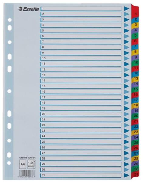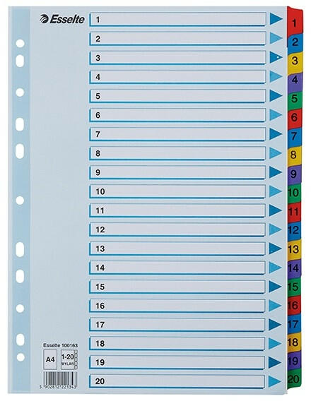 Regiszter ESSELTE Mylar A/4 laminált karton 1-20 Tartós regiszter élénk színkombinációkban. Nagyméretű téglalapok az előlapon a tartalom feltüntetésére. Erős, tartós, laminálással megerősített regiszter fülek Megerősített lefűzőrész az előlapon 1-20 felirattal rendelkező regiszter fülek a dokumentumok gyors eléréséhez Hagyományos, 11-lyukú lefűzőrész A4 méret