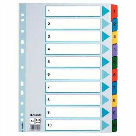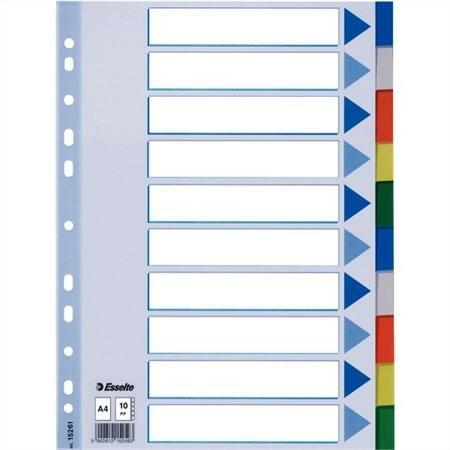 Regiszter, műanyag, A4, 10 részes, Esselte - elválasztólap visszafogott színkombinációkban - nagyméretű téglalapok az előlapon a tartalom feltüntetésére - 0,12 mm vastag PP alapanyag - hagyományos, 11-lyukú lefűzőrész - 10 színes fül a könnyű rendszerezéshez