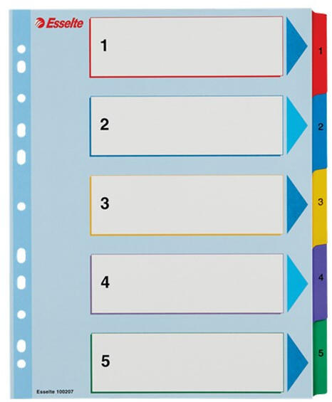 Regiszter ESSELTE A/4 maxi laminált karton újraírható 1-5 - többször használható regiszter élénk színkombinációkban - újraírhatő előlap nagyméretű téglalapokkal a tartalom feltüntetésére - újraírható, karton regiszter megerősített fülekkel és lefűzőrésszel - a laminált előlapon könnyen feltüntethető és módosítható/ felülírható a tartalom - találja meg