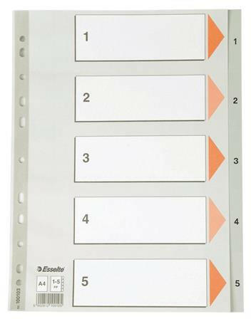 Regiszter, műanyag, A4, 1-5, ESSELTE, szürke - szürke színű regiszter - nagyméretű téglalapok az előlapon a tartalom feltüntetésére - hagyományos, 11-lyukú lefűzőrész - 0,12 mm vastag PP alapanyag - megerősített lefűzőrész az előlapon - 1-5 felirattal rendelkező regiszter fülek a dokumentumok gyors eléréséhez - méret: 225x297 mm