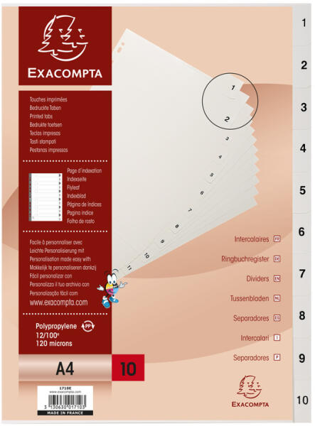 Exacompta elválasztólapok PP, A4, 1-10, szürke A4-es méretű elválasztólapok Újrahasznosított polipropilénből készült, amely puhává és szakadásállóvá teszi a lapokat Előre lyukasztva, így a legtöbb irattartóba és mappába beilleszthetőek Előre nyomtatott fülek 1-10. oldalig, 10 részből áll Szín: szürke