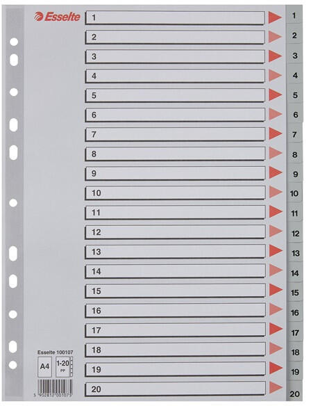 Esselte A4 1-20 műanyag regiszter Szürke színű regiszter. Nagyméretű téglalapok az előlapon a tartalom feltüntetésére. Megerősített lefűzőrész az előlapon 1-20 felirattal rendelkező regiszter fülek a dokumentumok gyors eléréséhez Hagyományos, 11-lyukú lefűzőrész A4 méret 0,12 mm vastag PP alapanyag