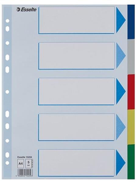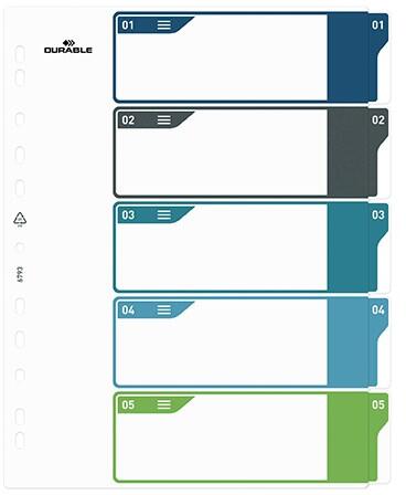 Elválasztólap visszafogott színkombinációkban. Nagyméretű téglalapok az előlapon a tartalom feltüntetésére. Megerősített lefűzőrész az előlapon5 színes fül a könnyű rendszerezéshezHagyományos, 11-lyukú lefűzőrészA4 méret0,12 mm vastag PP alapanyag
