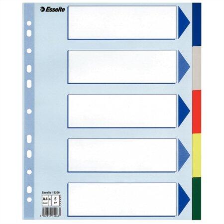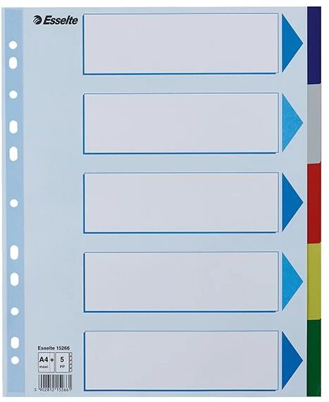 - elválasztólap visszafogott színkombinációkban - nagyméretű téglalapok az előlapon a tartalom feltüntetésére - 0,12 mm vastag PP alapanyag - hagyományos, 11-lyukú lefűzőrész - 5 színes fül a könnyű rendszerezéshez - megerősített lefűzőrész az előlapon - az A4+ méretű elválasztólapok szélesebbek a lefűzhető tasakoknál, így segítségükkel az iratrendezőbe lef