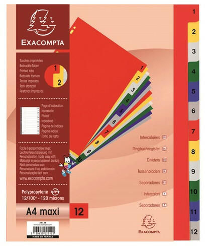 Regiszter PP Exacompta 12 részes színes maxi Méret: A/4 maxi Kiváló minőségű színes, műanyag regiszterek Alapanyag: 120 mikronos műanyag Előre lyukasztott, így lefűzhető mappába vagy dossziéba