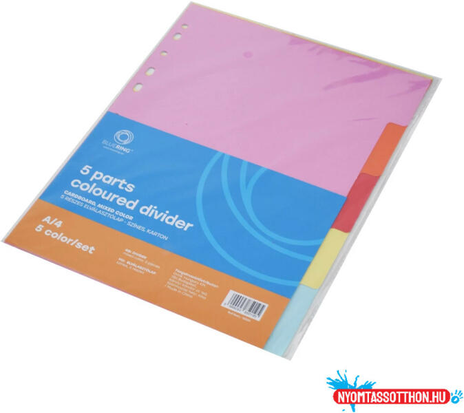 Elválasztólap, színes karton 5 részes Bluering® Színregiszteres karton elválasztólap iratok kategorizálásához. 11 lefűzőlyukkal, A4 méretű iratokhoz. Katalóguskód: 12223