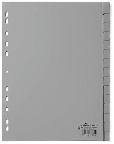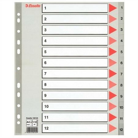 Regiszter, műanyag, A4 maxi, 1-12, Esselte, szürke - szürke színű regiszter - nagyméretű téglalapok az előlapon a tartalom feltüntetésére - megerősített lefűzőrész az előlapon - hagyományos, 11-lyukú lefűzőrész - 0,12 mm vastag PP alapanyag - az A4+ méretű regi