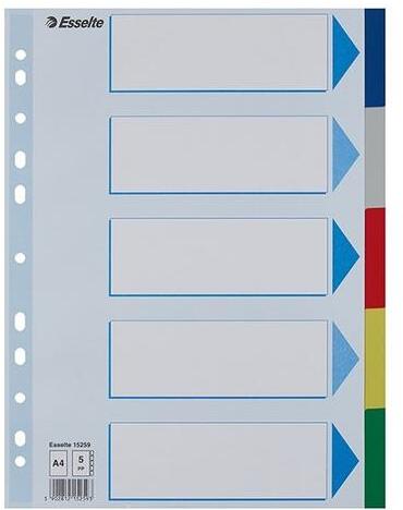 Elválasztólap visszafogott színkombinációkban. Nagyméretű téglalapok az előlapon a tartalom feltüntetésére. Megerősített lefűzőrész az előlapon 5 színes fül a könnyű rendszerezéshez Hagyományos, 11-lyukú lefűzőrész A4 méret 0,12 mm vastag PP alapanyag