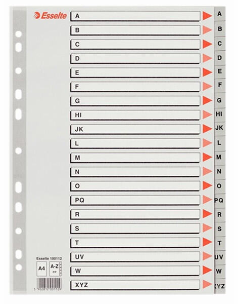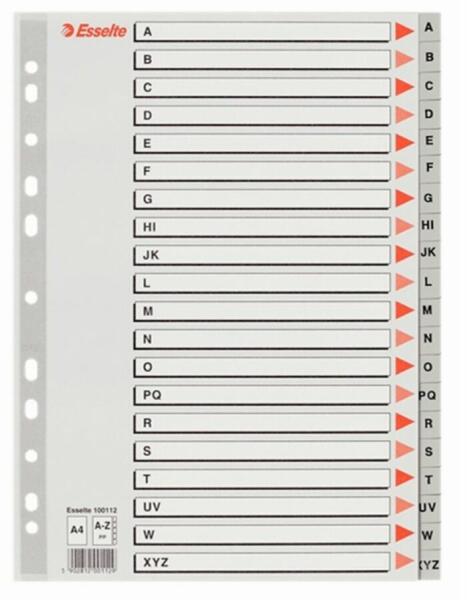 Esselte A4 A-Z-ig műanyag regiszter Szürke színű regiszter. Nagyméretű téglalapok az előlapon a tartalom feltüntetésére. Megerősített lefűzőrész az előlapon A-Z felirattal rendelkező regiszter fülek a dokumentumok gyors eléréséhez Hagyományos, 11-lyukú lefűzőrész A4 méret 0,12 mm vastag PP alapanyag