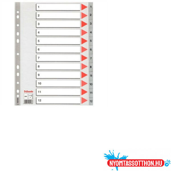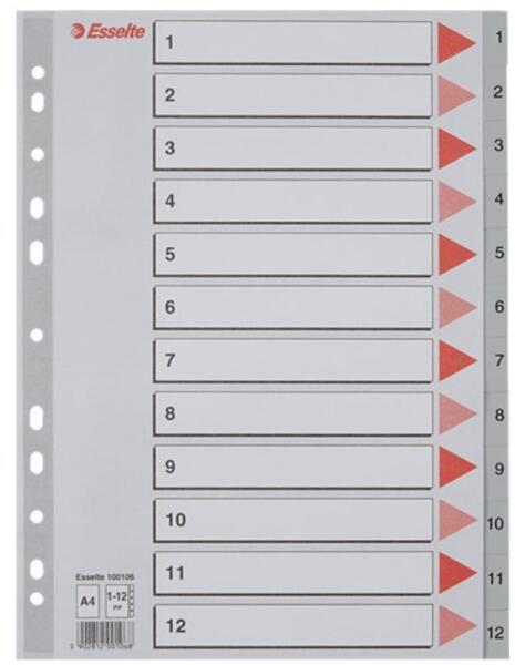 Regiszter műanyag A4, 1-12 Esselte szürke Szürke színű regiszter. Nagyméretű téglalapok az előlapon a tartalom feltüntetésére. Megerősített lefűzőrész az előlapon 1-12 felirattal rendelkező regiszter fülek a dokumentumok gyors eléréséhez Hagyományos, 11-lyukú lefűzőrész A4 méret 0,12 mm vastag PP alapanyag