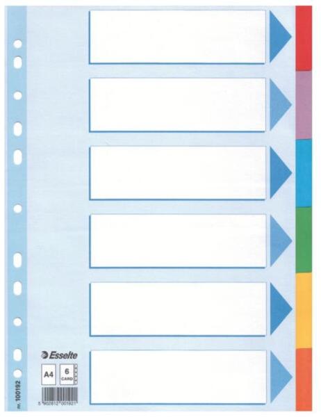 Tartós elválasztólap élénk színkombinációkban. Újrahasznosított, Blue Angle minősítéssel rendelkező karton alapanyag. Nagyméretű téglalapok az előlapon a tartalom feltüntetésére. Megerősített lefűzőrész az előlapon 5 színes fül a könnyű rendszerezéshez Hagyományos, 11-lyukú lefűzőrész A4 méret Erős, 160 g-os karton alapanyag Blue Angel minősített, újrahasz