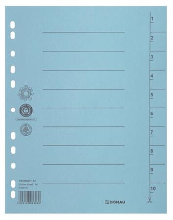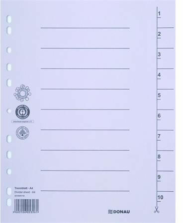 Regiszter, karton, A4, DONAU, szürke - lefűzött dokumentumok kategorizálására - színes elválasztólapok - újrahasznosított, 250 g/m2 kartonból készült - 100 db/csomag - 4 lefűzőlyuk - méret: 235x300 mm