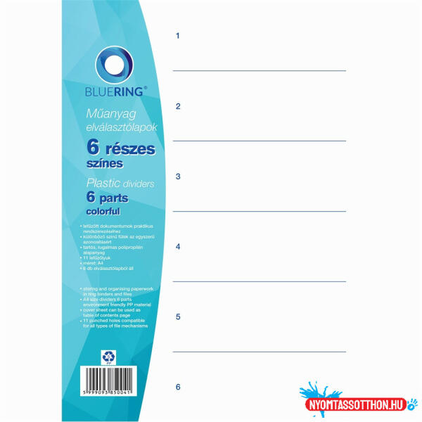 Elválasztólap, színes műanyag 6 részes Bluering® Minőségi PP alapanyagból készült elválasztólap iratok kategorizálásához, praktikus rendszerezéséhez. 11 lefűzűlyukkal, A4 méretű iratokhoz.