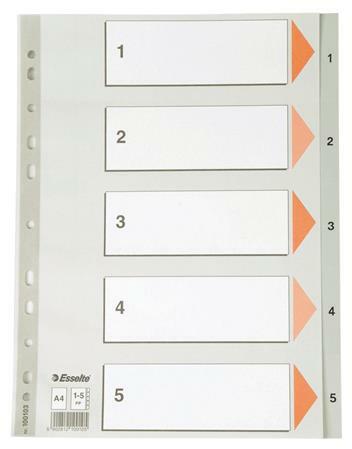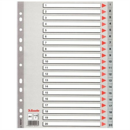 Regiszter, műanyag, A4, 1-20, ESSELTE, szürke - szürke színű regiszter - nagyméretű téglalapok az előlapon a tartalom feltüntetésére - megerősített lefűzőrész az előlapon - 1-20 felirattal rendelkező regiszter fülek a dokumentumok gyors eléréséhez - 0,12 mm vastag PP alapanyag - hagyományos, 11-lyukú lefűzőrész