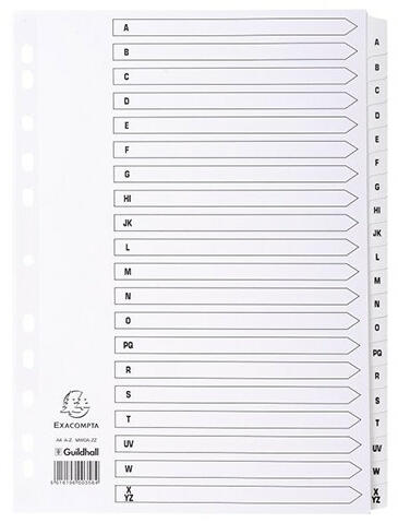 Regiszter karton Exacompta A/4 A-Z 20 részes fehér Méret: A/4 Kiváló minőségű fehér karton elválasztólapok, laminált fülekkel Alapanyag: 160gr-os karton Előre lyukasztott, így lefűzhető mappába vagy dossziéba FSC minősítéssel rendelkező termék