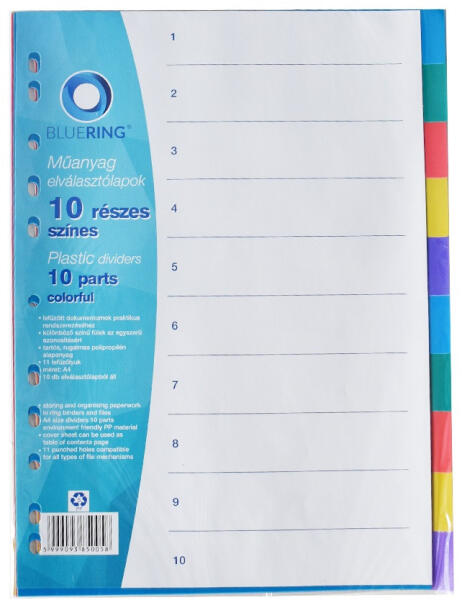 ELVÁLASZTÓLAP SZÍNES MŰANYAG 10 RÉSZES BLUERING Minőségi PP alapanyagból készült elválasztólap iratok kategorizálásához, praktikus rendszerezéséhez. 11 lefűzűlyukkal, A4 méretű iratokhoz. Katalóguskód: 561GPSR: Orink Hungary Kft. ; H-1151 Budapest, Károlyi Sándor út 160. ; info@orinkhungary. hu; https://orink. hu/